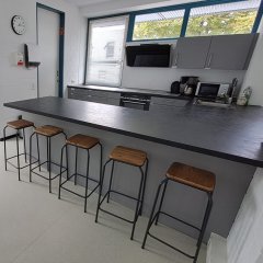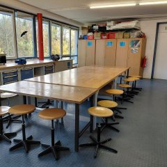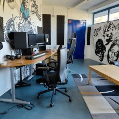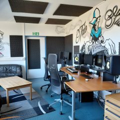 (90 m²). Im Obergeschoss steht ein Werkraum (40 m²), ein Ton- und Aufnahmestudio (10 m²) und ein weiterer Raum mit Küche für verschiedene Angebote zur Verfügung.