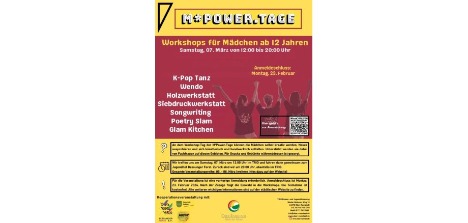 Infos und Anmeldung für Fachkräfte und Eltern am 05.03. über den Jugendhof Bessunger Forst, hi@woodiversum.org. Für die Workshops am 07.03. bitte über die beteiligten Kinder- und Jugendförderungen Babenhausen, Griesheim, Münster, Ober-Ramstadt, Reinheim, Roßdorf, Pfungstadt oder ebenfalls dem Jugendhof Bessunger Forst anmelden oder informieren. Im geschützten Rahmen erhalten die Teilnehmerinnen Raum zur kreativen Entfaltung sowie Reflexions- und Austauschmöglichkeiten. Dabei sollen alle Events niedrigschwellig und kostenfrei bzw. auf Spendenbasis angeboten werden. Begleitung für Interessentinnen werden durch kooperierende Jugendförderungen angeboten.