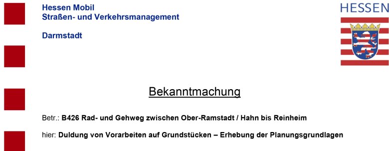 Bekanntmachung Hessen Mobil: B426 Rad- und Gehweg zwischen Ober-Ramstadt/ Hahn bis Reinheim