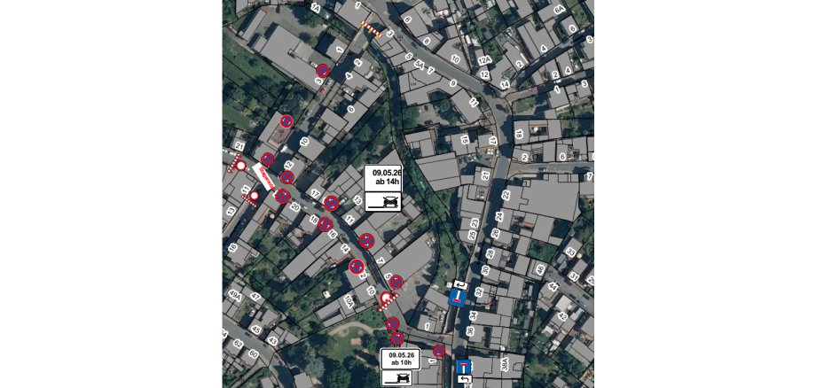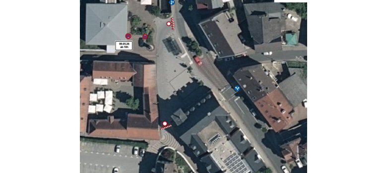 - Absperrung Hammergasse (Rathausvorplatz): ab Samstag, den 09.05.2026, 10:00 Uhr – Sonntag, den 10.05.2026, 12:00 Uhr. Der Parkplatz hinter dem Rathaus ist dann nur noch über die Zufahrt Entengasse/Hammergasse erreichbar.